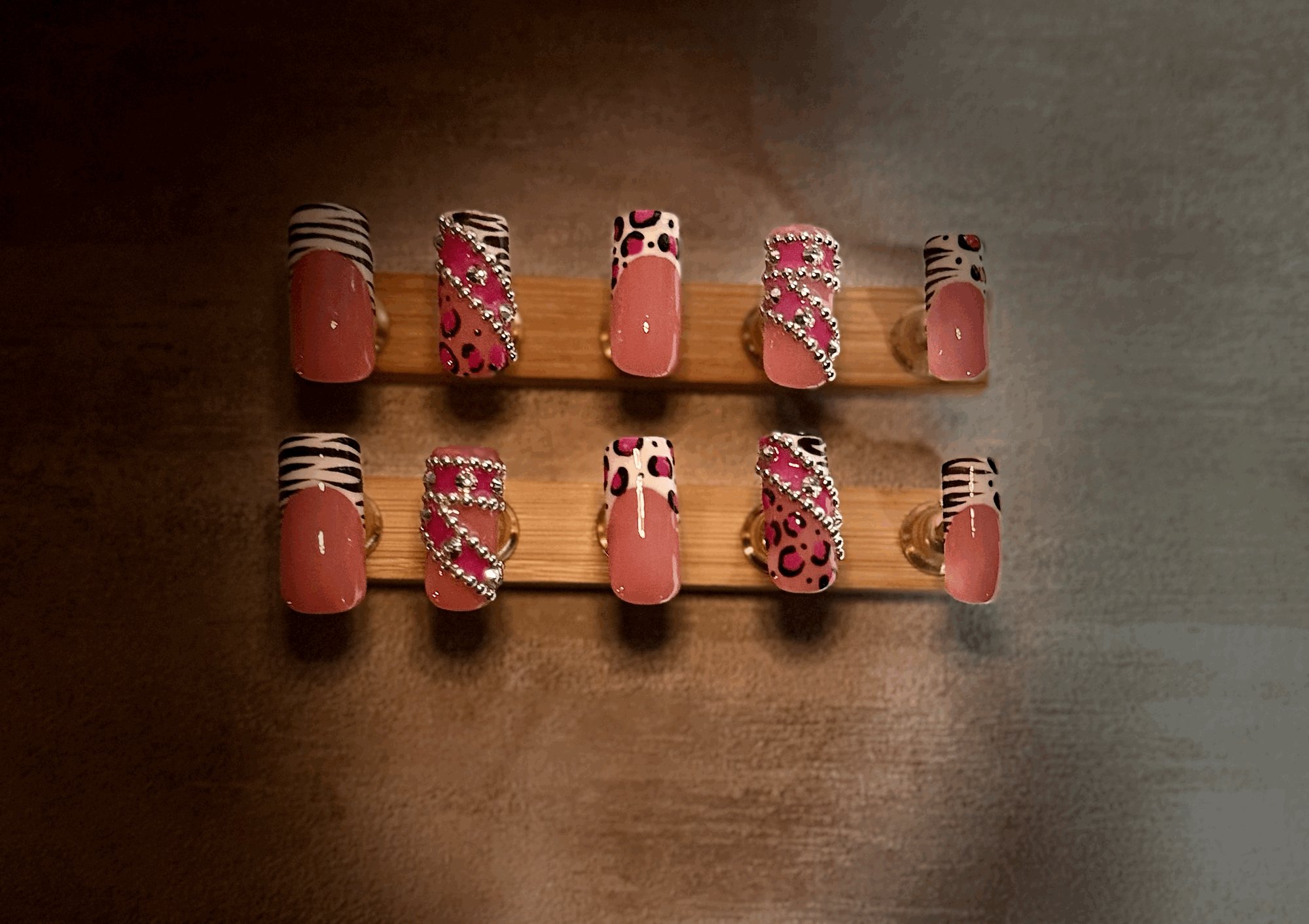 MEDIUM LENGTH PINK ANIMAL PRINT SILVER Y2K ACRYLIC NAILS